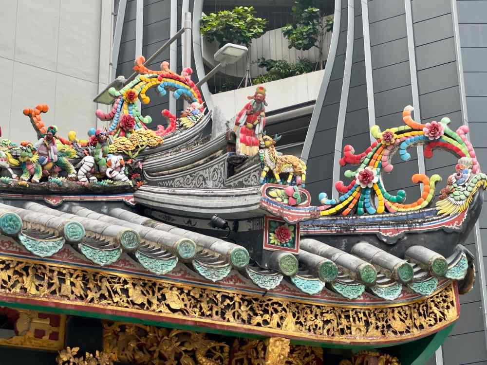 Yueh Hai Ching Temple was constructed following the typical three-hall layout of traditional Chinese temples, complete with covered courtyards linking the entrance and main halls. Its roof, characteristic of Teochew architecture, features a relatively straight ridge. One of its most striking elements is the collection of intricate three-dimensional sculptures adorning the roof, which illustrate scenes of Chinese towns alongside mythical plants and animals symbolising longevity, prosperity, and strength.
