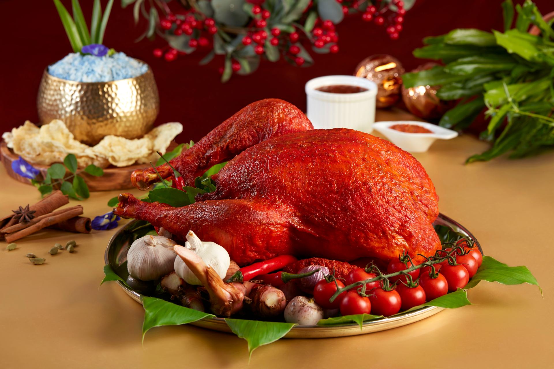 Turkey with local flavour has long been the rage. Some are undeniably inspiring, others… not so much. This year, Fullerton Hotel Singapore has hit on a fabulous rendition: Turkey Masak Merah ($238, 6 to 7kg). Spiced with aromatics inherent to the traditional Malay chicken stew, such as ginger, garlic, chillies, coriander and tomatoes, Fullerton’s Turkey Masak Merah is served with blue pea nasi lemak made with basmati rice, emping crackers, sambal belacan and a spiced tomato gravy.